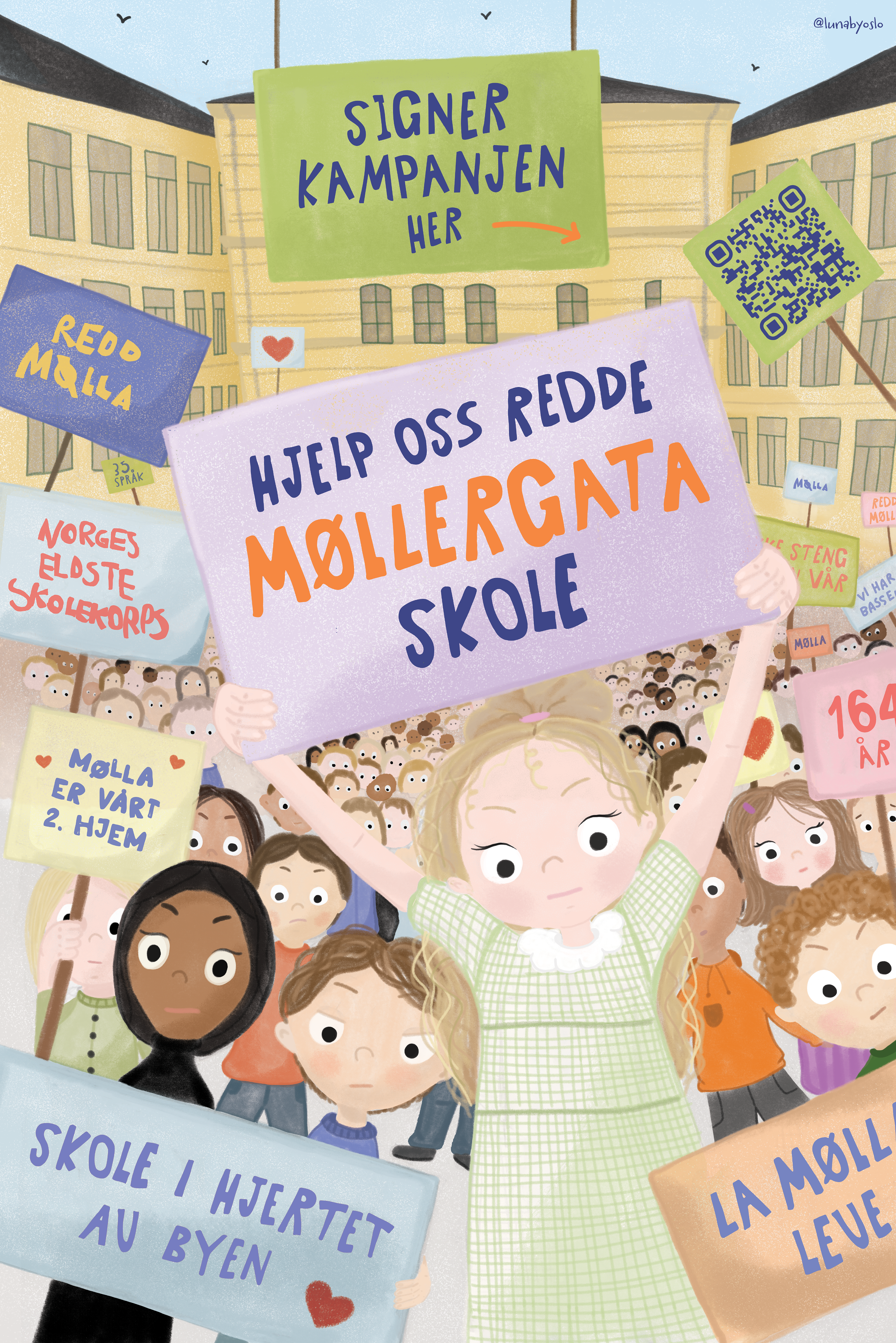 Plakat og støtteknapp for Møllergata Skole